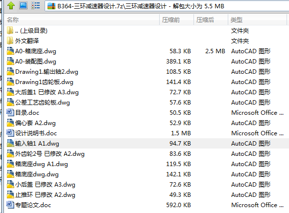 三环减速器是一种新型的齿轮机构,其基本结构是有一根低速轴、二根高速轴和三片转动环板构成。各轴均平行配置,相同的两根高速轴带动三片传动板呈120°相位差作平面运动,通过传动环板与低速轴上的齿轮相啮合,形成大传动比。各轴的轴端可以单独或者同时传输动力。而三环式传动机构自成体系。按基本型的单级传动,增加高速与低速轴的数量,改变高速与低速轴的相互位置,可以形成若干派生型机构系列。此外,该传动装置因采取独特的“平行轴----动轴”三环式传动原理,基本构件的运动和受力均衡,又充分的运用了功率分流和多齿内啮合。