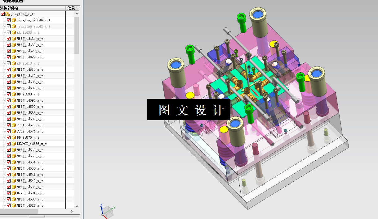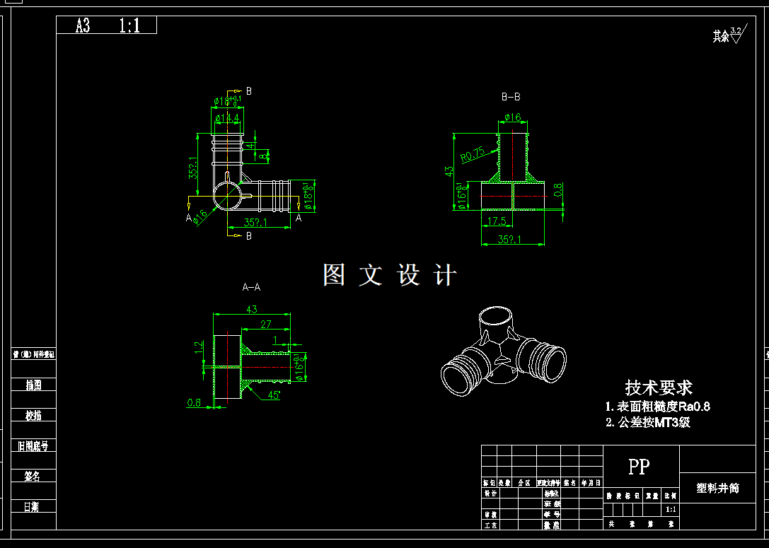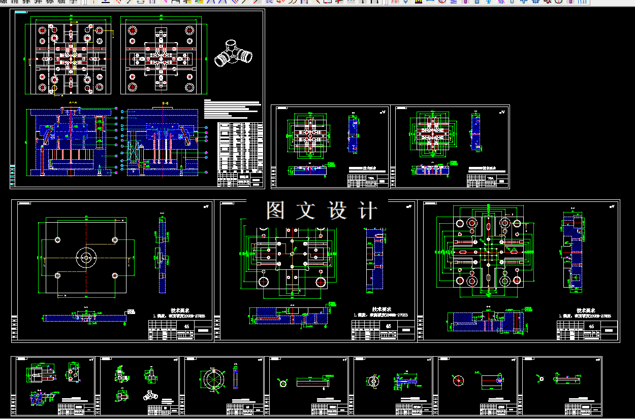 过大量的计算以确定模具复杂的结构和尺寸,通过不断的计算与修改,并在指导老师的悉心关怀和耐心指导下进行多次的反复修改,最终画出了装配图和零件图。 该模具采用一模四腔、滑块侧抽芯的设计方案。然后针对该方案进行了重点讨论。