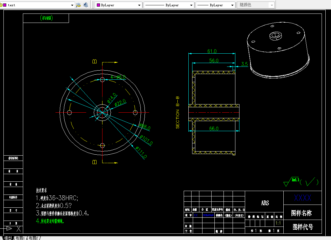 塑料是一种可塑性的合成高分子材料,具有重量轻且坚固,耐化学腐蚀, 电绝缘性好,价格便宜,可塑性好等特点,广泛应用于电脑、手机、汽车、电机、 电器、家电和通讯产品制造中。 注射成形是成形塑件的主要方法之一, 是指使用注射机将热塑性塑料熔体在 高压下注入到模具内经冷却固化获得产品的方法。注射的优点是生产速度快,效 率高,操作可自动化,能成型形状复杂的零件,特别适合大量生产。 本次课程设计的产品为塑料端盖,具有重量轻,强度高,耐腐蚀,易清洁等 特点,为大批量生产产品。本次设计在针对产品进行工艺性分析后,确定模具分 型面、 型腔数目、 浇口形式、 位置大小; 其中最重要的是确定型芯和型腔的结构, 以及它们的定位和紧固方式。此外还进行了脱模机构的设计,合模导向机构的设 计,冷却系统的设计等。最后绘制完整的模具装配总图和主要的模具零件图及编 制成型零部件的制造加工工艺过程卡片。实践证明:该模具结构合理、可靠,并 能保证产品质量,对此类注射产品的模具设计有参考价值。