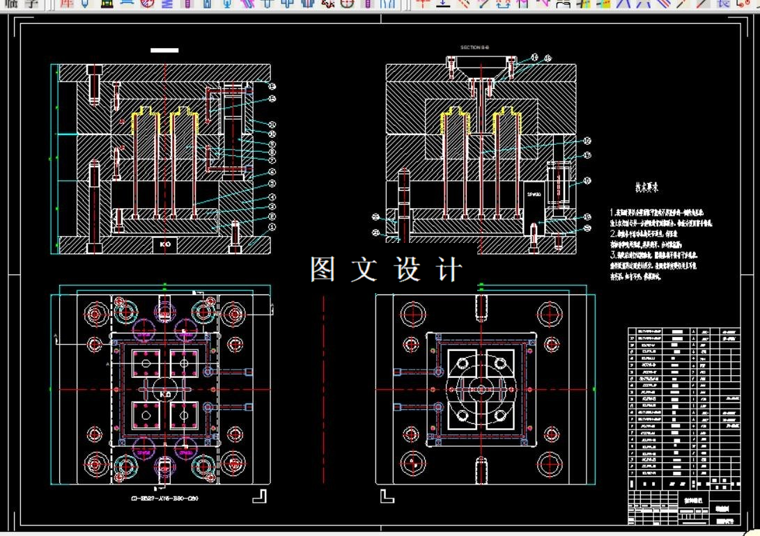 该塑件作为方罩壳,外形为倒有圆角的抽壳不规则体,其中两个角做了改变,为倒角和圆弧,制件内部为一个通孔,制件的内部俩侧之间有角度要求,所以在模具设计和制造上要有精度的定位措施和良好的加工工艺以保证塑件精度。采用一模四腔 侧进胶 顶针顶出 两板模 单分型面的方案。
