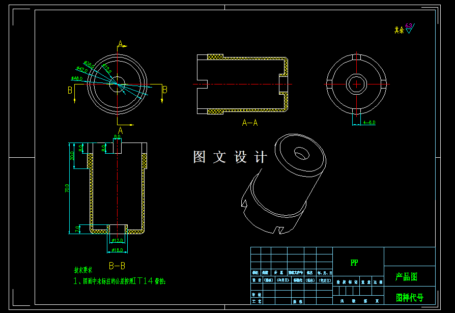 本次设计的产品为纱桶,具有重量轻,强度高,耐腐蚀,易清洁等 特点,为大批量生产产品。本次设计在针对产品进行工艺性分析后,确定模具分 型面、 型腔数目、 浇口形式、 位置大小; 其中最重要的是确定型芯和型腔的结构, 以及它们的定位和紧固方式。此外还进行了脱模机构的设计,合模导向机构的设 计,冷却系统的设计等。最后绘制完整的模具装配总图和主要的模具零件图及编 制成型零部件的制造加工工艺过程卡片。