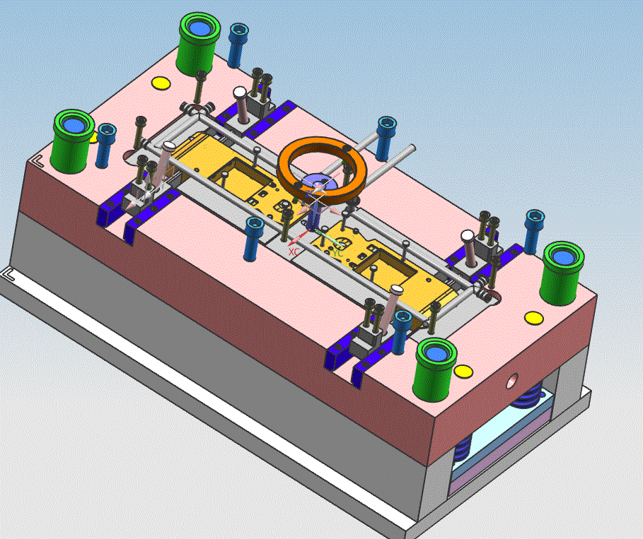 参考资料玩具车底壳注塑模具设计主题。模具为一模两腔,侧浇口,塑件上侧凹结构采用斜导柱抽芯机构成型,推杆推出,本资料含有模具装配图、模具三维、多张模具零件图,模具设计说明书等等
