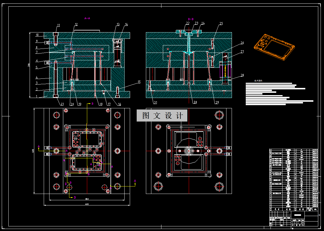参考资料PSP游戏机面板注塑模具设计为主题。模具为一模两腔,侧浇口,顶杆顶出,塑件上倒扣结构采用斜推杆抽芯机构成型,本资料含有模具装配图、模具三维、多张模具零件图,模具设计说明