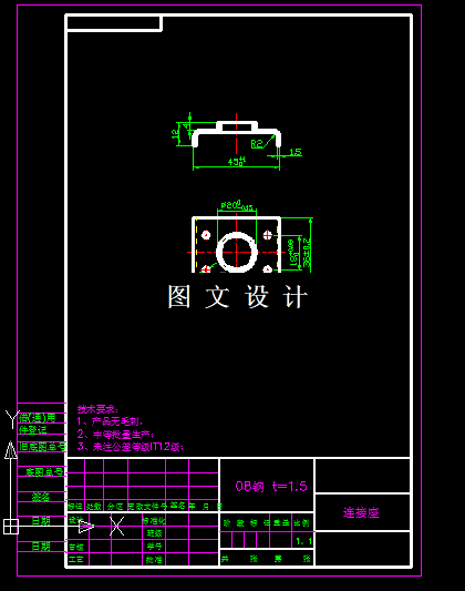 此制件的形状较简单,两侧为U形弯曲,中间有翻孔,在设计模具之前,首先要对工件进行简单的计算,计算展开尺寸和翻孔的预孔直径,通过工艺计算,计算好后绘制出展开图,根据展开图的形状,绘制出合理的排样图,模具装配图,零件图。