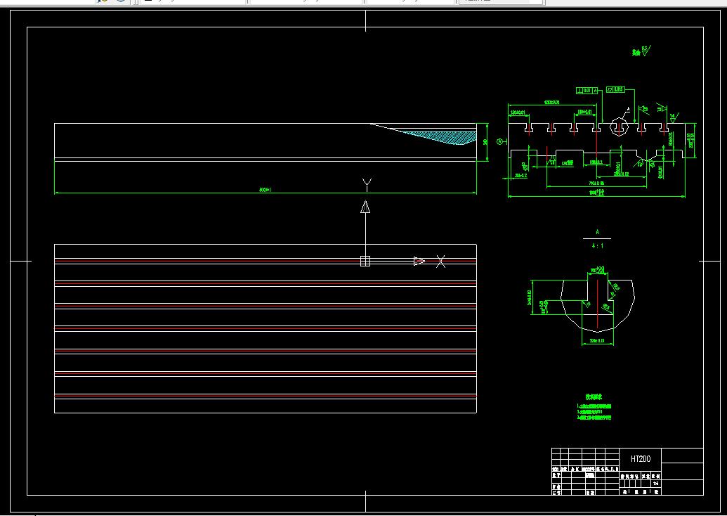 XK2313-3数控定梁定柱龙门铣床纵向进给部件设计,主要技术参数: (1)工作台面积(宽 X 长):1300X3000mm; (2)工作台 T 型槽9-22X130 (3)三向行程:3000/1500 /800mm (4)三向快速移动速度:10/10/10m/min; (5)工作台最大承重 kg:5000kg; (6)快速启动加速时间 s:0.3S; 工作台厚度:215mm 工作台重 量(kg)2650kg 定位精度:X0.02/1000 0.04/全程 Y0.02/1000 0.03/ 全 程; Z 0.02 重复定位精度0.01 (2)三向进给传动形式:均采用同步带减速滚珠丝杠传动形式,减速比推荐为 X(纵向)2、2.5 或 3(设计选择) (3)三向滚珠丝杠传动的运动组合形式:丝杠旋转和轴向固定,螺母移动。 (4)三向导轨:X、Y 向采用滚动导轨,Z 向采用矩形滑动+贴塑导轨结构。 (5)预计 X 向丝杠系统平均相对最大温升 2C。 (6)采用华中数控系统及其配套交流伺服电机,三轴控制三轴联动,主轴伺服 控制。 正向压力载荷近似分布