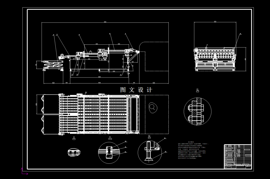 模型设计主要采用solidworks方法进行三维模型建模,cad进行绘制,以此来确定这些方案,对这些想法进行验证,来分析机构运动。其主要机械结构部分包括:上层送皮机构,双层羊皮工作台送皮机构、自动送料码垛机构、垂直升降接料机构四个部分。双列羊皮自动码垛机机架部分主要被采用侧板连接构成,上层送皮机构主要由毛刷和传送带组成。码垛机构主要部分是由电机、滚筒、气缸、传输带和支撑件构成,可以直接实现羊皮的传递与码垛,羊皮从一个烘箱里传送出来,通过毛刷传动至上层送皮机构传输,再通过毛刷传递至给双层羊皮工作台送皮机构,第一层工作台上方有传感器,此传感器负责给自动送料码垛机构传递接料机构的垂直升降,第二层工作台上方也有传感器,负责给自动送料码垛机构传递伸缩码垛信号,经由双层工作台的传送带将羊皮送至前方的自动送料码垛机构,最后码垛至垂直升降接料机构垂直结束一轮码垛工作循环。