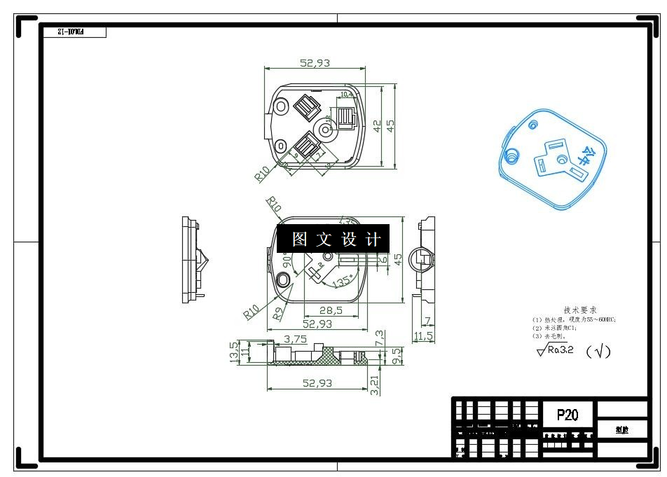 设计的制品为ABS公牛插座注射模设计,利用UG来完成制品模3D模型,利用CAD/UG来完成其装配图和零件图。模具采用了侧抽芯。模具有模具UG三维,加cad装配图,加成型零件图。
