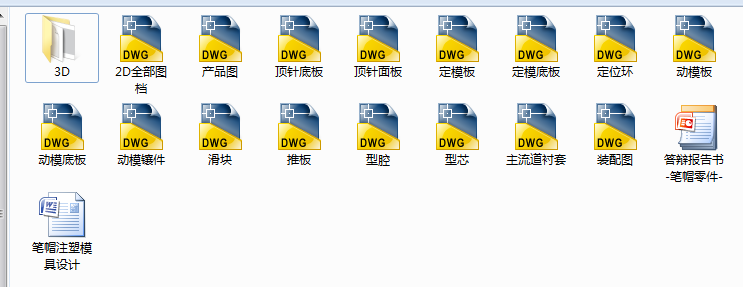 塑料是一种可塑性的合成高分子材料,具有重量轻且坚固,耐化学腐蚀, 电绝缘性好,价格便宜,可塑性好等特点,广泛应用于电脑、手机、汽车、电机、 电器、家电和通讯产品制造中。 注射成形是成形塑件的主要方法之一, 是指使用注射机将热塑性塑料熔体在 高压下注入到模具内经冷却固化获得产品的方法。注射的优点是生产速度快,效 率高,操作可自动化,能成型形状复杂的零件,特别适合大量生产。 本次毕业设计的产品为笔帽,具有重量轻,强度高,耐腐蚀,易清洁等 特点,为大批量生产产品。本次设计在针对产品进行工艺性分析后,确定模具分 型面、 型腔数目、 浇口形式、 位置大小; 其中最重要的是确定型芯和型腔的结构, 以及它们的定位和紧固方式。此外还进行了脱模机构的设计,合模导向机构的设 计,冷却系统的设计等。最后绘制完整的模具装配总图和主要的模具零件图及编 制成型零部件的制造加工工艺过程卡片。实践证明:该模具结构合理、可靠,并 能保证产品质量,对此类注射产品的模具设计有参考价值。
