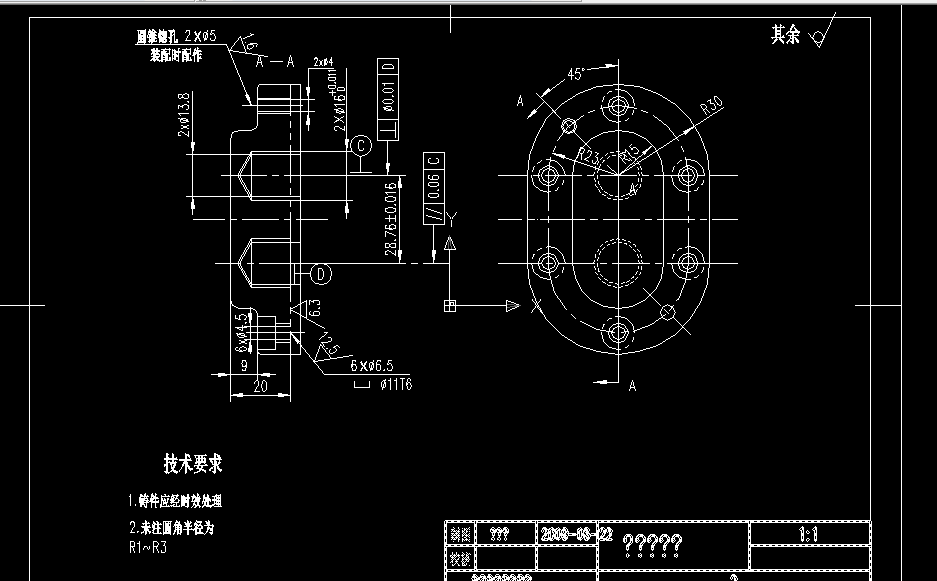 泵盖零件结构较简单,而且为铸件,外表面为要求较高精度要求,铸造即可满足,与其它接触面处的端面精度要求较高,需要经过粗车、半精车加工,保证密封配合性。