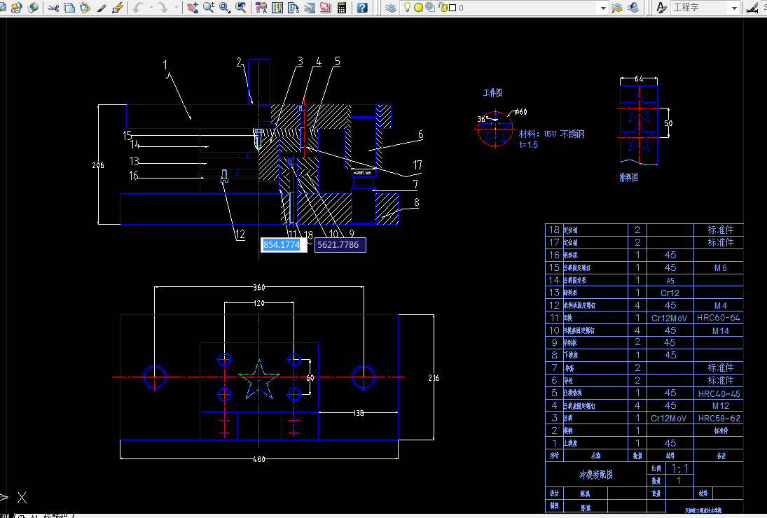 关键词:五角星落片模、单工序模、材料、凸模、凹模。