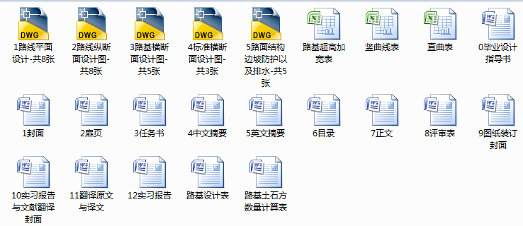 拟建公路位于丘陵区地带,地形复杂,排水困难,挖填方比较大。主要设计内容有:选线定线、路线方案比选;平面线形设计,包括平曲线设计、里程桩号与坐标计算等;纵断面设计,包括纵坡设计、竖曲线设计、平纵组合设计等;横断面设计,路面结构设计和挡土墙设计,其中详细设计为选取有代表性的一公里路段进行横断面类型设计、超高设计、行车视距验算、土石方数量计算等;路基路面设计,包括路基形式选用,边坡稳定性验算,边坡防护,路面结构设计; 排水设计等。