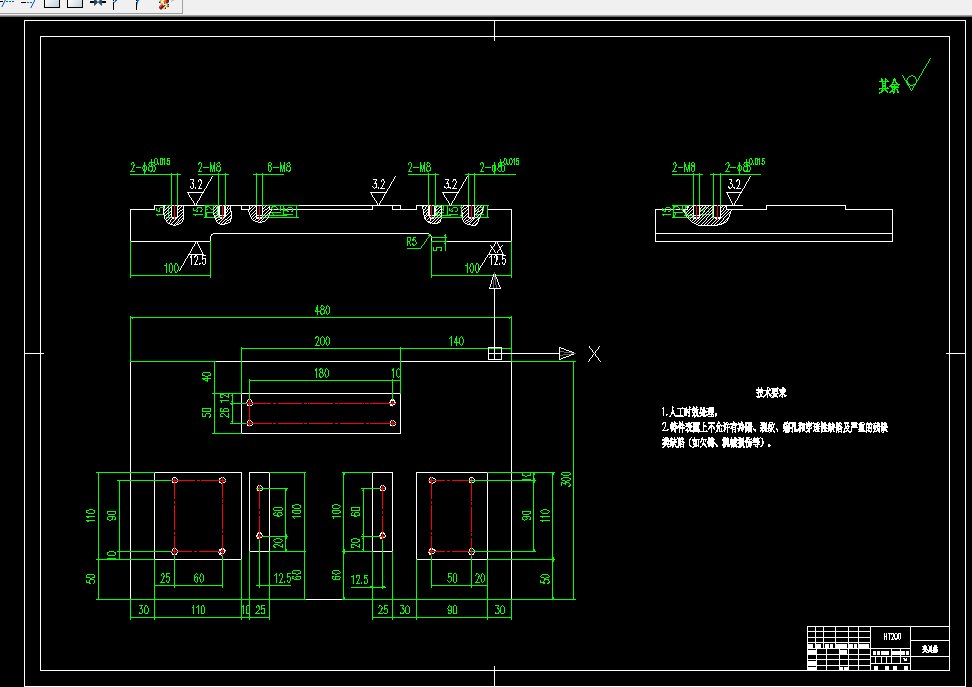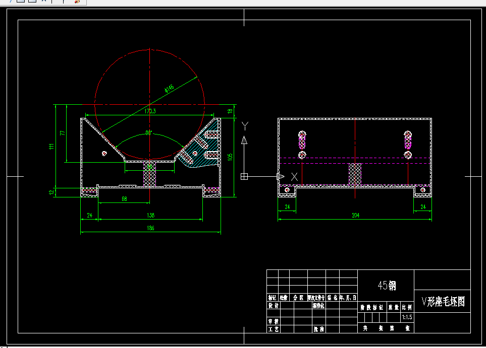 V形座的加工工艺规程和钻2-M6螺纹孔的工艺设计、工序设计以及专用夹具的设计三部分。在工艺设计中要首先对零件进行分析,了解零件的工艺再设计出毛坯的结构,并选择好零件的加工基准,设计出零件的工艺路线;接着对零件各个工步的工序进行尺寸计算,关键是决定出各个工序的工艺装备及切削用量;然后进行专用夹具的设计,选择设计出夹具的各个组成部件,如定位元件、夹紧元件、引导元件、夹具体与机床的连接部件以及其它部件;计算出夹具定位时产生的定位误差,分析夹具结构的合理性与不足之处,并在以后设计中注意改进。