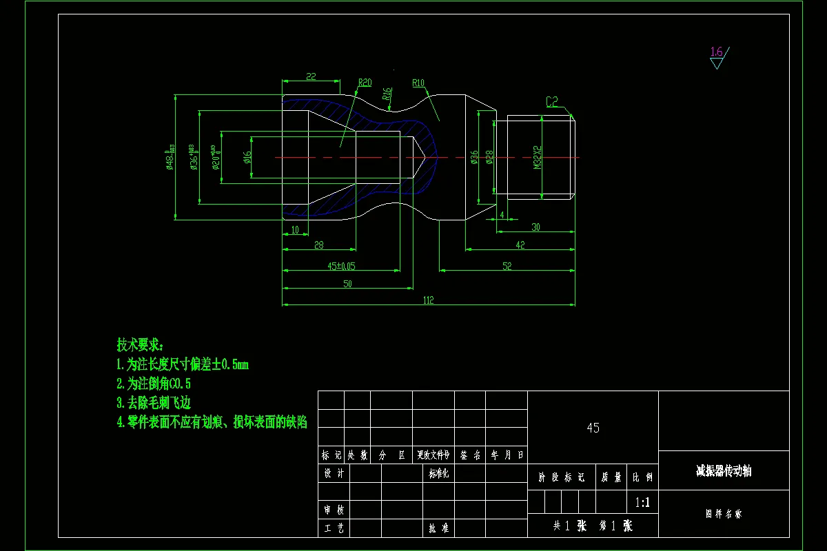 本设计是减振器传动轴数控车削加工工艺设计这个课题,因为他涉及到的知识面非常广阔,基本将我们在大学里所学知识综合运用起来。它突出了数控加工的特点,零件在加工过程中的工艺性特点。从图纸设计,机床的选择,刀具的选择,工艺分析,零件的数控编程,仿真加工结果的全过程,将理论知识和实际操作紧密联系起来。从图样设计开始到零件加工结束,说明零件加工与设计的基本过程。并编制加工工艺卡片,编写出加工程序,最终完成说明书的编写。