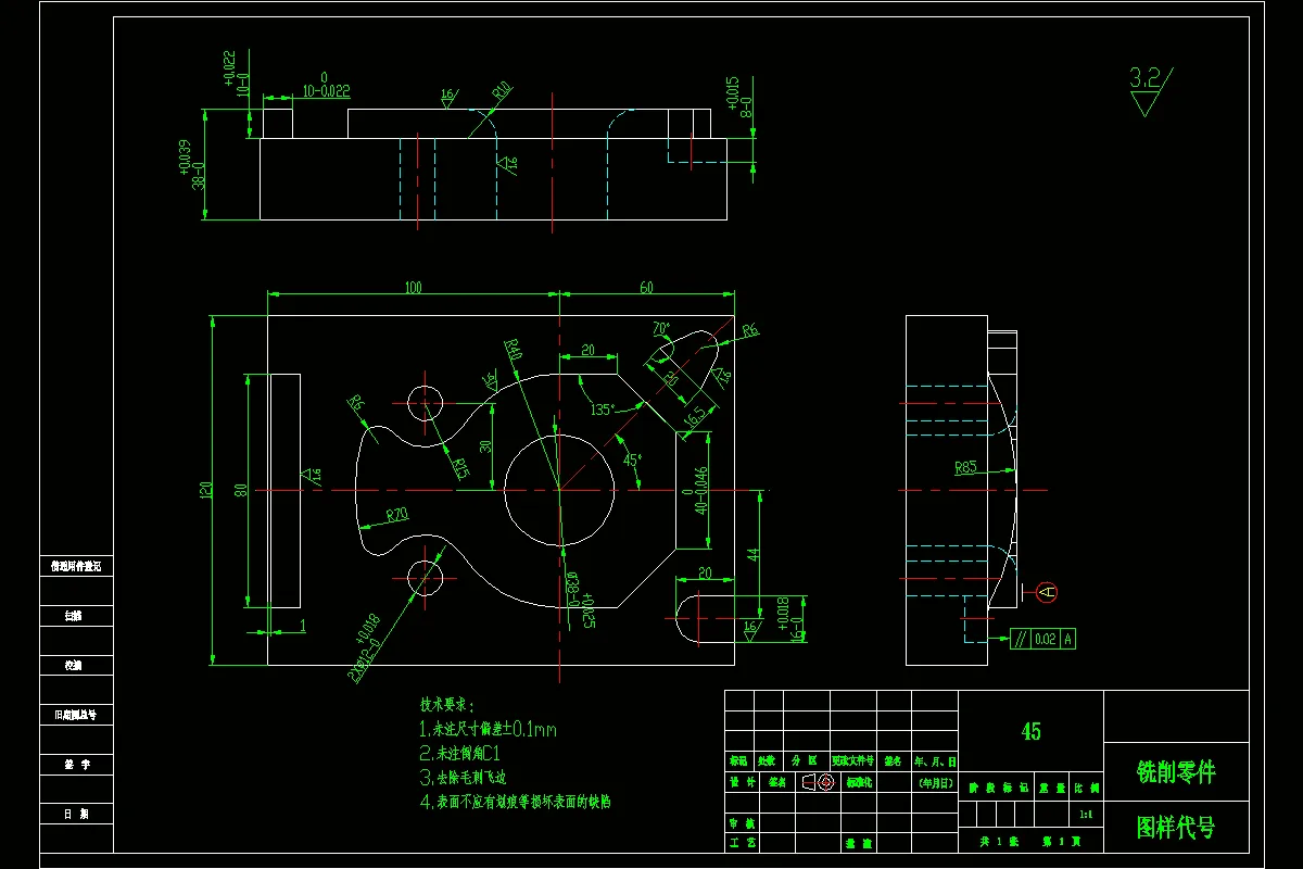 本次设计任务是对零件的加工工艺设计与CAM,使用CAD制图软件将零件的二维图形画出来,再用UG软件画出三维图纸。接着对零件结构、精度、技术要求进行分析。设计加工零件的数控工艺方案,选择毛坯材料及大孝加工用的刀具、加工机床,以及合理的切削参数等。选择出最佳的加工工艺方案,然后使用UG中的CAM模块对零件的数控加工程序进行编制,完成本次设计。