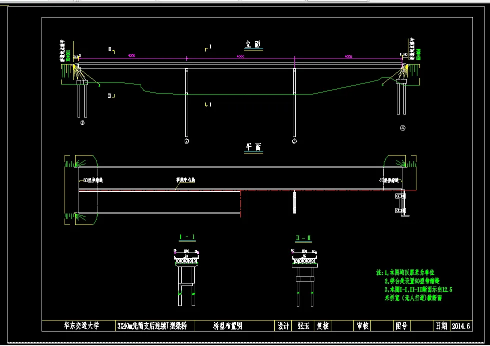 本设计主要受跨中正弯矩的控制,当跨径增大时,跨中由恒载和活载产生的弯矩将急剧增加,是材料的强度大部分为结构重力所消耗,因而限制其跨越能力,本设计采用40m标准跨径,合理地解决了这一问题。在设计中通过主梁内力计算、应力钢筋的布置、主梁截面强度与应力验算、行车道板及支座、桥墩的计算等等,完美地构造了一座预应力混凝土先简支后连续T型梁桥,而且验算完全符合要求,所用方法均与新规范相对应。本设计重点突出了预应力在桥梁中的使用,这也正体现了我国桥梁的发展趋势。