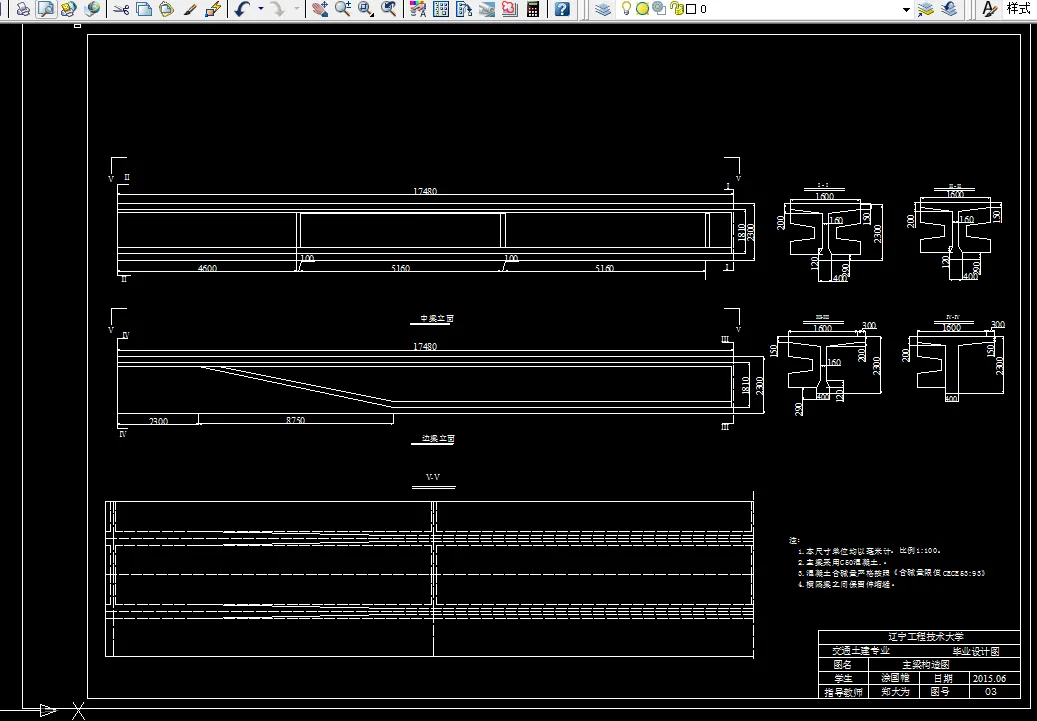 本文主要包含了此桥的设计和计算过程。首先搜集原始资料,对主梁尺寸进行初步设计,然后对上部结构进行主梁内力计算、配筋计算,最后对桥梁的承载力等进行验算,保证桥梁符合规范要求。