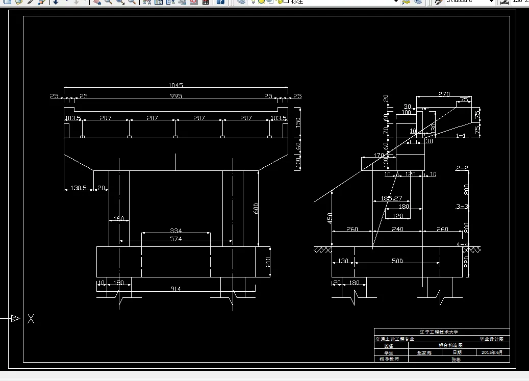 在桥台设计中,主要进行了桥台一般构造尺寸的拟定,台帽,台墙及桩基计算。台墙承受上部构造恒载、活载、支座摩阻力、后台土压力、溜坡主动土压力等外力。在桥梁设计与计算中采用了杠杆法、偏心压力法、m法等计算方法,并参照了有关规范与规定进行设计与校核。
