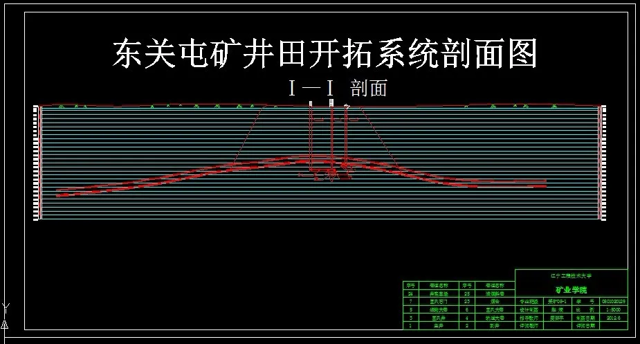 东关屯矿拥有两层可采煤层,煤厚分别是4.7m和8.8m。煤层南北平均长度为3200m,东西平均长度为4500m,井田面积约为14.43km2。平均倾角为7°,工业储量为2.65亿吨,设计储量为2.54亿吨,可采储量为1.79亿吨。本设计从矿井的开拓、开采、运输、通风、提升及工作面的采煤方法等各个环节进行了详细的叙述,设计严格遵守《煤炭工业设计规范》和《煤矿安全规程》,整个矿井采用了先进的皮带运输,提高了运输能力,为矿井的增产打下了良好的运输基础。采煤方法采用倾向长壁综合机械化采煤方法,工作面支护方式为液压支架支护方式,端头支护采用端头支架。本设计采用立井单水平开拓,主井采用箕斗提升,副井采用罐笼提升,大巷采用集中布置,通风方式为中央并列式。本次设计是东关屯新井设计,地质资料都是在实习矿上搜集的,在指导教师的指导下,并合理运用平时及课堂上积累的知识,查找有关资料和文献,力求设计出一个高产、高效、安全的现代化矿井。
