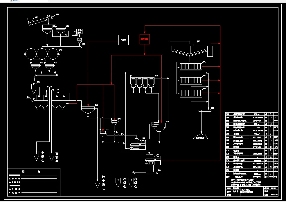 设计首先对原煤质量情况进行综合分析,绘制可选性曲线,并对原煤进行可选性评定,可选性为易选。全面了解原煤煤质特点,在此基础上完成了选煤流程的确定;原煤出井口检查性首选除杂除去铁器和杂物,筛上物破碎后进入原煤仓。出仓后先预先脱泥,然后进入主选车间,跳汰分级,出的精煤经筛分后经皮带运至混中块煤仓与粒煤仓,末煤脱水后出产品,筛下物与预先脱泥筛下物经角锥池与浓缩机进行煤泥处理,粗煤泥混入末煤中,煤泥压滤后运至煤泥场。然后进行了流程计算,设备选型,厂房布置,经济概算,图纸绘制等工作。
