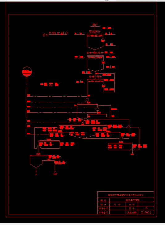 对设计的工艺流程进行了各项工艺指标的计算,通过多种方案的比较最终确定了各项工艺流程所需的工艺设备。依据计算所得的数据及所选工艺设备,进行厂房的总体布置,同时对厂房进行合理的设备配置,并完成了破碎、主厂房设备配置图,全厂设备联系图和数质量、矿浆、工艺流程图等的绘制。