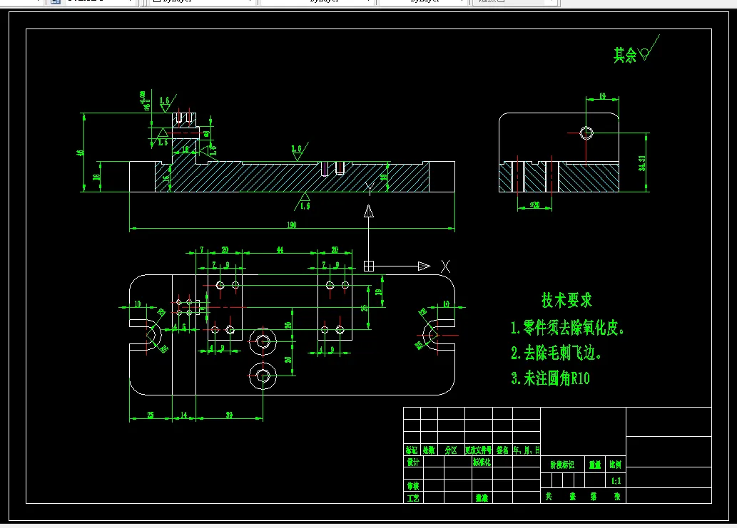 齿条加工工艺规程及其夹具设计是包括零件加工的工艺设计、工序设计以及专用夹具的设计三部分。在工艺设计中要首先对零件进行分析,了解零件的工艺再设计出毛坯的结构,并选择好零件的加工基准,设计出零件的工艺路线;接着对零件各个工步的工序进行尺寸计算,关键是决定出各个工序的工艺装备及切削用量;然后进行专用夹具的设计,选择设计出夹具的各个组成部件,如定位元件、夹紧元件、引导元件、夹具体与机床的连接部件以及其它部件;计算出夹具定位时产生的定位误差,分析夹具结构的合理性与不足之处,并在以后设计中注意改进。