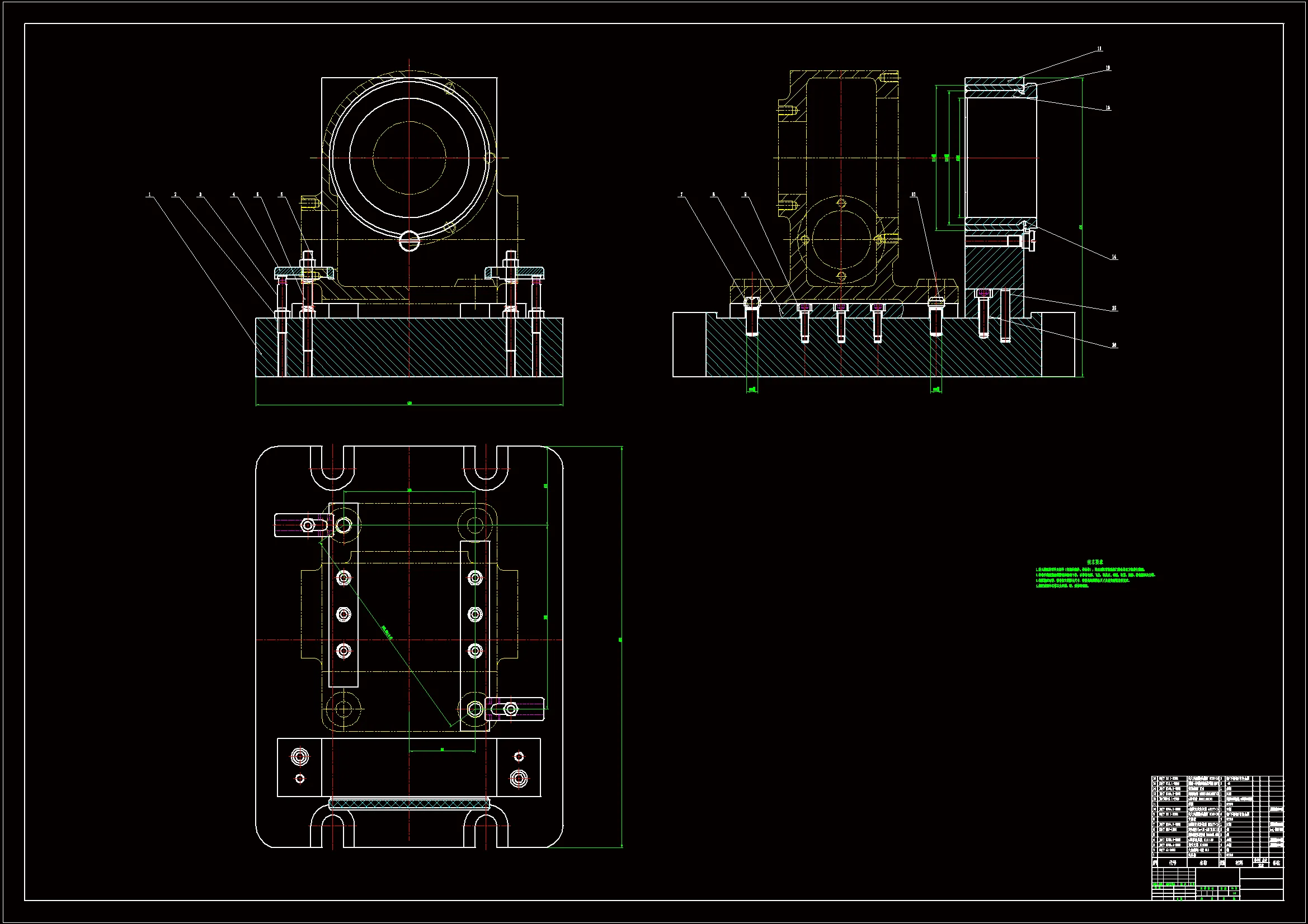 对大批生产的箱体进行了工艺规程的制订和专用夹具的设计。工艺方案采用了“一面两孔”的定位方式,将加工过程划分为粗加工。并按照工序集中安排其加工顺序,编写工序卡,主要选择了专用机床和工装。采用AutoCAD对钻6-M16的螺纹孔和镗Φ164孔的两道工序专用夹具设计绘制二维装配图。镗Φ164孔专用夹具采用了A型定位销和B型定位销、镗套、镗模,压板夹紧工件、并设计了单个螺旋夹紧机构;钻6-M16螺纹孔的专用夹具采用了A型定位销和B型定位销、压板夹紧工件、快换钻套、并设计了铰链钻模板。