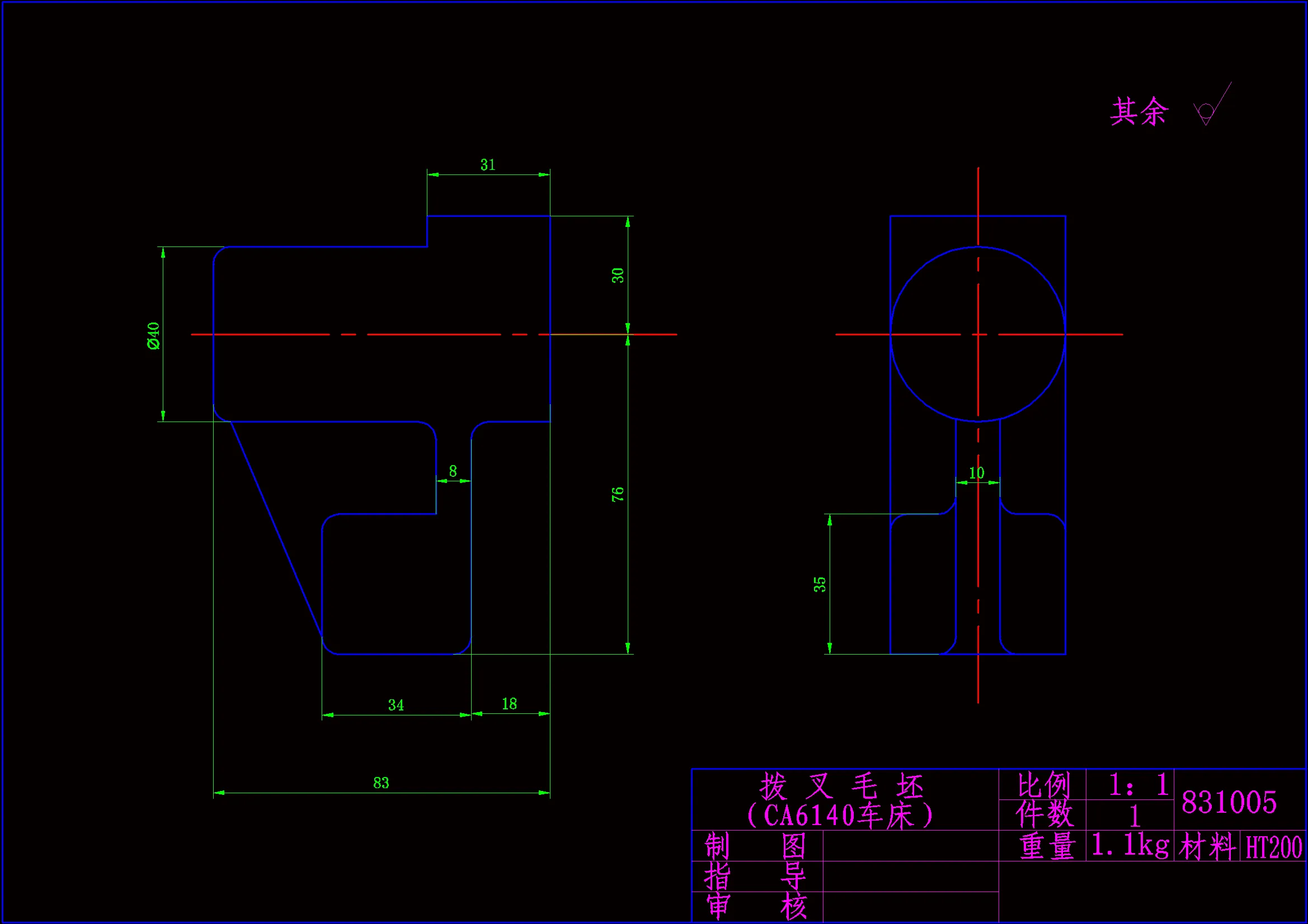 此次设计是对C6140车床831005拨叉零件加工工艺和夹具设计,其零件为铸造件,具有体积小、形状复杂的特点。在工艺过程中的任何工序,用来迅速、方便、安全地安装工件的装置,都可称为夹具。例如焊接夹具、检验夹具、装配夹具、机床夹具等。其中机床夹具最为常见。夹具通常由定位元件(确定工件在夹具中的正确位置)、夹紧装置、对刀引导元件(确定刀具与工件的相对位置或导引刀具方向)、分度装置(使工件在一次安装中能完成数个工位的加工,有回转分度装置和直线移动分度装置两类)、连接元件以及夹具体(夹具底座)等组成。本次设计的是拨叉零件的专用夹具。专用夹具是指专为某一工件的某道工序而专门设计的夹具。其特点是结构紧凑,操作迅速、方便、省力,可以保证较高的加工精度和生产效率,但设计制造周期较长、制造费用也较高。当产品变更时,夹具将由于无法再使用而报废,一般适用于产品固定且批量较大的生产中。