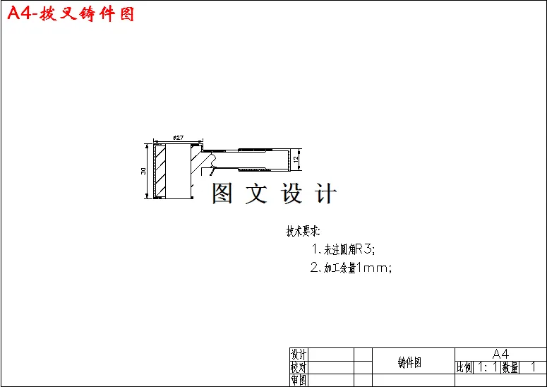 拨叉的轮廓尺寸为:Φ25、Φ14、R20、R26、中心距60、拨叉厚16、通孔深28。砂型铸造条件下该轮廓尺寸允许的最小壁厚查《铸造工艺学》表3-2-1得:最小允许壁厚为3~4 mm。而设计支座的最小壁厚为10mm。符合要求。端盖设计壁厚较为均匀,两壁相连初采用了加强肋,可以有效构成热节,不易产生热烈。属于中小型零件且要大批量生产。采用湿型粘土砂造型灵活性大,生产率高,生产周期短,便于组织流水生产,易于实现机械化和自动化,材料成本低,节省烘干设备、燃料、电力等,还可延长砂箱使用寿命。因此,采用湿型粘土砂机器造型,模样采用金属模是合理的。