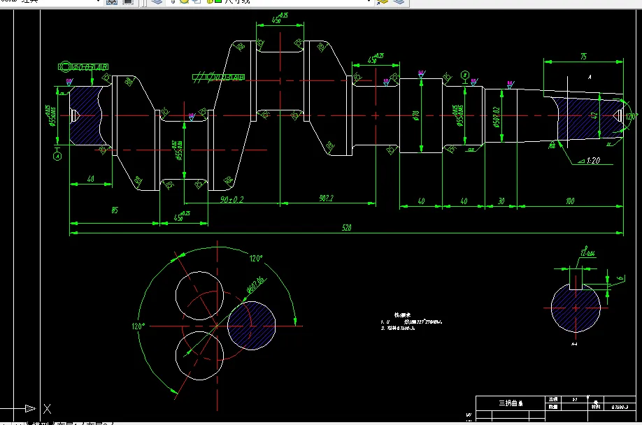此次毕业设计任务是对三拐曲轴零件的机械加工工艺夹具的设计,主要包括对零件图的分析、毛坯的选择、零件的装夹、工艺路线的制订、刀具的选择、切削用量的确定、加工工艺文件的填写。选择正确的加工方法,设计合理的加工工艺过程。此外还对三拐曲轴零件的工序的加工设计了专用夹具.