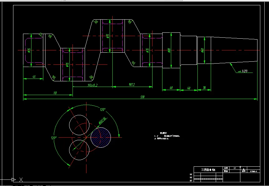 题目所给定的零件是单杠内燃机上的曲轴,它位于内燃机连杆处,曲轴产生旋转运动,带动连杆使活塞产生往复运动,并将旋转转为直线运动,它在工作过程中将承受周期性的复杂的交变载荷。其主要作用是传递转矩,是连杆获得所需的动力。 5