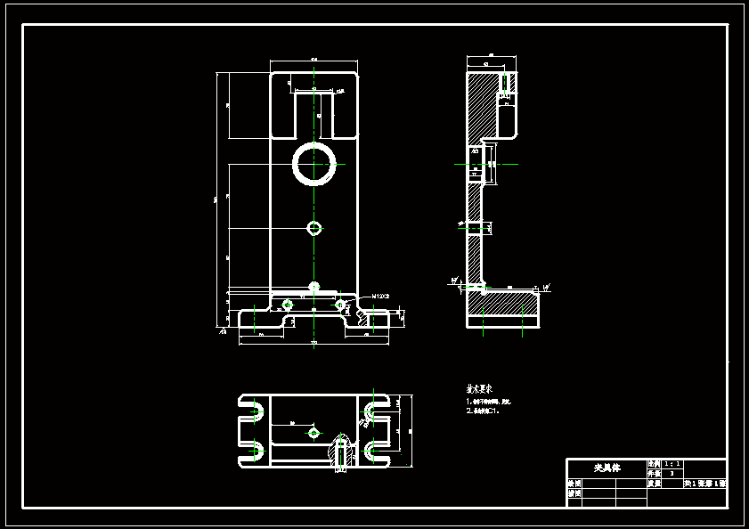 刹车支架加工工艺及钻孔夹具设计 卧式钻:左侧面定位控制3个自由度(俯视图),右侧V型块定位控制2个自由度、并夹紧,后方使用支撑钉定位、控制1个自由度。夹紧面选择直径16mm的孔外圆夹紧,可以保证在夹紧过程中不影响零件形状,刚性较好