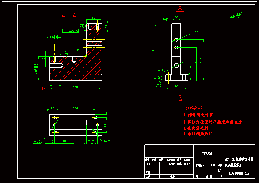 刹车支架加工工艺及钻孔夹具设计 卧式钻:左侧面定位控制3个自由度(俯视图),右侧V型块定位控制2个自由度、并夹紧,后方使用支撑钉定位、控制1个自由度。夹紧面选择直径16mm的孔外圆夹紧,可以保证在夹紧过程中不影响零件形状,刚性较好