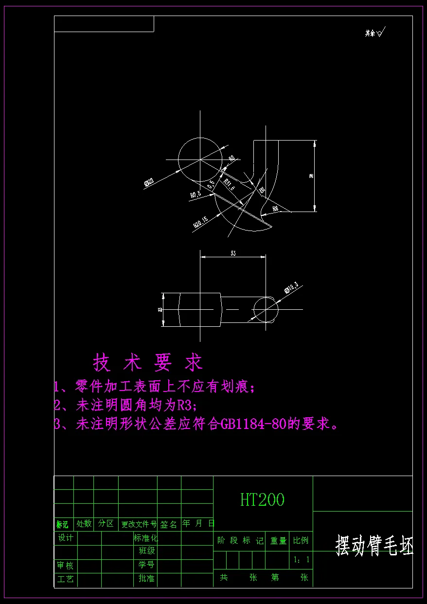摆动臂零件加工工艺及夹具设计是包括零件加工的工艺设计、工序设计以及专用夹具的设计三部分。在工艺设计中要首先对零件进行分析,了解零件的工艺再设计出毛坯的结构,并选择好零件的加工基准,设计出零件的工艺路线;接着对零件各个工步的工序进行尺寸计算,关键是决定出各个工序的工艺装备及切削用量;然后进行专用夹具的设计,选择设计出夹具的各个组成部件,如定位元件、夹紧元件、引导元件、夹具体与机床的连接部件以及其它部件;计算出夹具定位时产生的定位误差,分析夹具结构的合理性与不足之处,并在以后设计中注意改进。