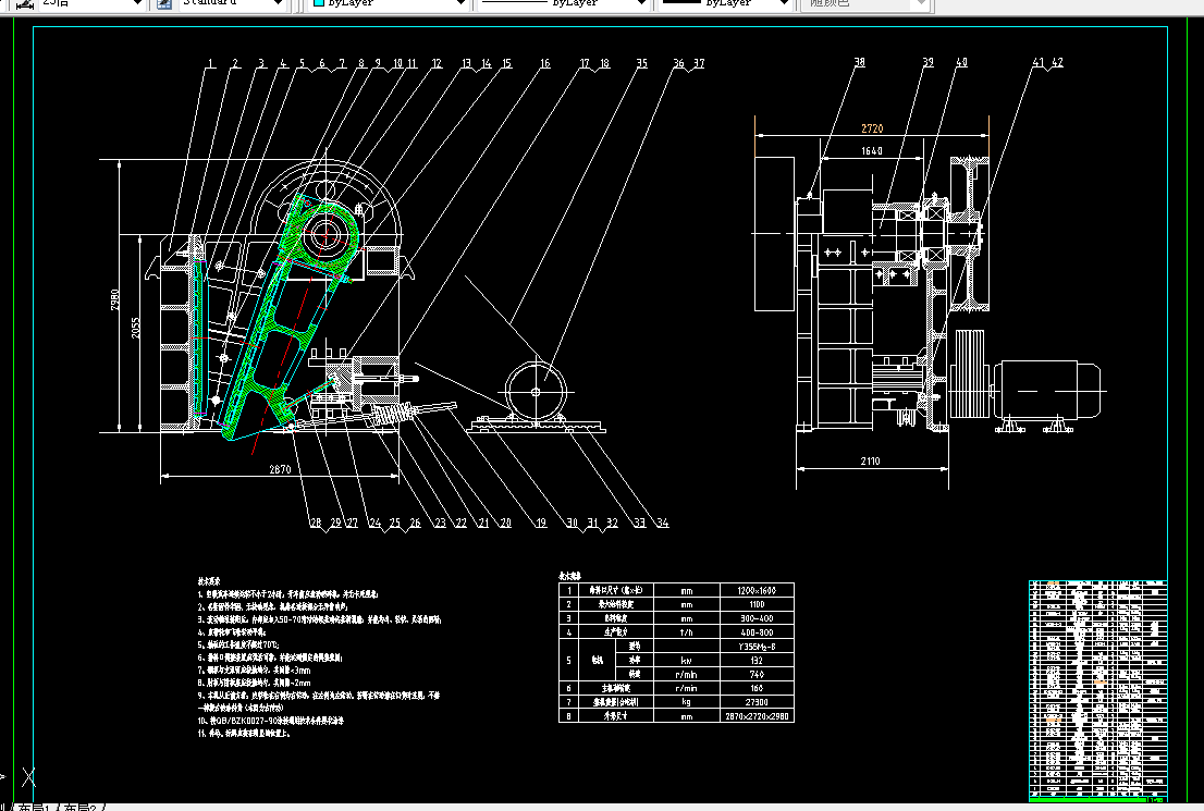 本设计需求参数为进料口尺寸:1200×1600mm;最大进料粒度:1100mm;处理能力:400-800 (t/h);偏心轴转速:160r/min;出料粒度:300-400(mm);电动机功率:132KW。设计分析了破碎机的发展现状和研究颚式破碎机的意义及复摆颚式破碎机机构尺寸对破碎性能的影响,计算确定了PE1200×1600的机构参数,设计内容主要包括复摆颚式破碎机的动颚、偏心轴、皮带轮、动颚齿板、定颚齿板、机架等一些重要部件;另外,对颚式破碎机的工作原理及特点和主要部件的作用作了介绍,包括保险装置、调整装置、机架结构、润滑装置等;同时对机器的参数(主轴转速、生产能力、破碎力、功率等)作了计算。此外,对破碎的意义、破碎工艺和破碎比的计算,颚式破碎机的主要部件的安装、操作及维修作了简单介绍。