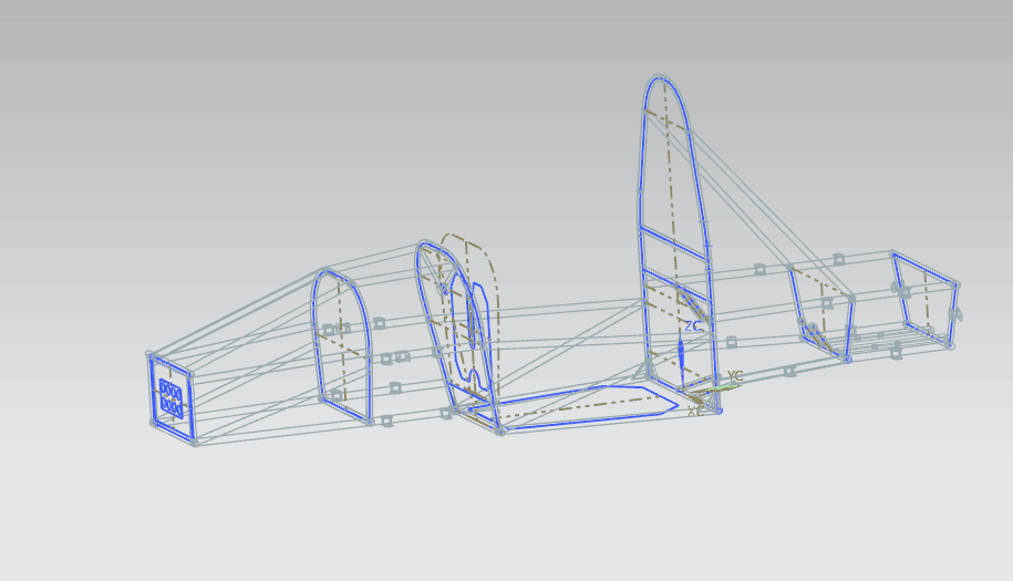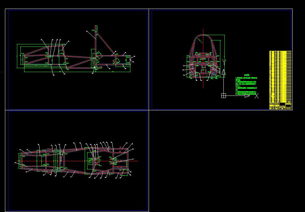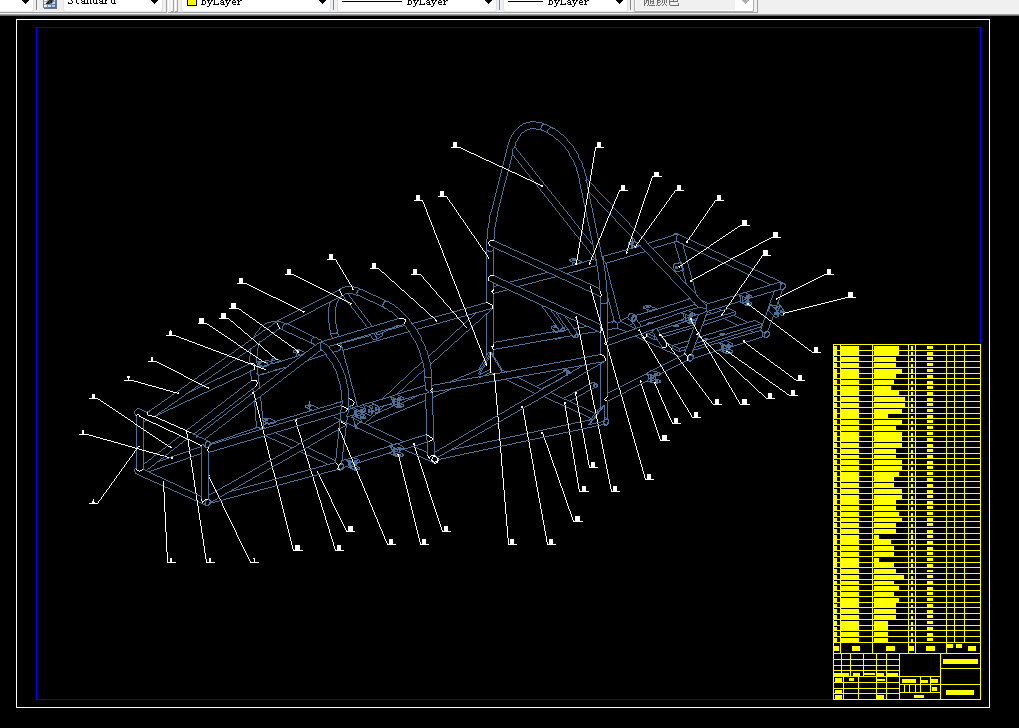 在车架设计之初,要将大赛的有关规定和评分标准完全掌握,对各部件该怎么布置,布置在什么方位有一个清晰的规划。同时为了使以后的车架结构设计更为合理,我参考了天津大学、湖南大学以及部分国外的车架。进入设计阶段后,在对比了车架的结构形式后,选择了桁架式的车架。根据强度要求,选择车架的材料。在确定了悬架的安装位置后,依据技术规范、赛车的整体布置、发动机以及人体模型确定车架大致的整体尺寸,然后建立几套车架的雏形;再优化车架结构使整体各个系统能合理的布置在车架上,直至使车架结构满足各个方面的要求。在几套车架结构基本定型以后,开始对车架进行结构受力分析、优化以及对比,选择结构合理质量最轻的车架。