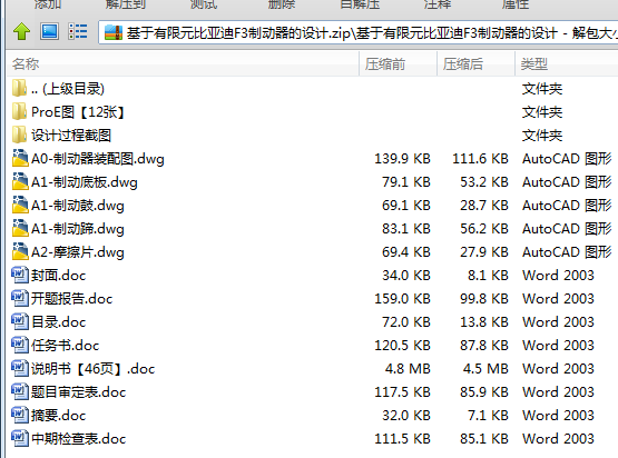 本设计说明书主要介绍了以比亚迪F3轿车为研究对象从而进行鼓式制动器的设计。首先介绍了鼓式制动器的发展及其结构,并通过对鼓式制动器和盘式制动器的结构及优缺点进行分析。最终确定采用双向双领蹄式鼓式制动器。在计算出设计参数后,通过PRO/E三维制图软件建立模型,用ANSYS软件进行对摩擦片的校核分析。