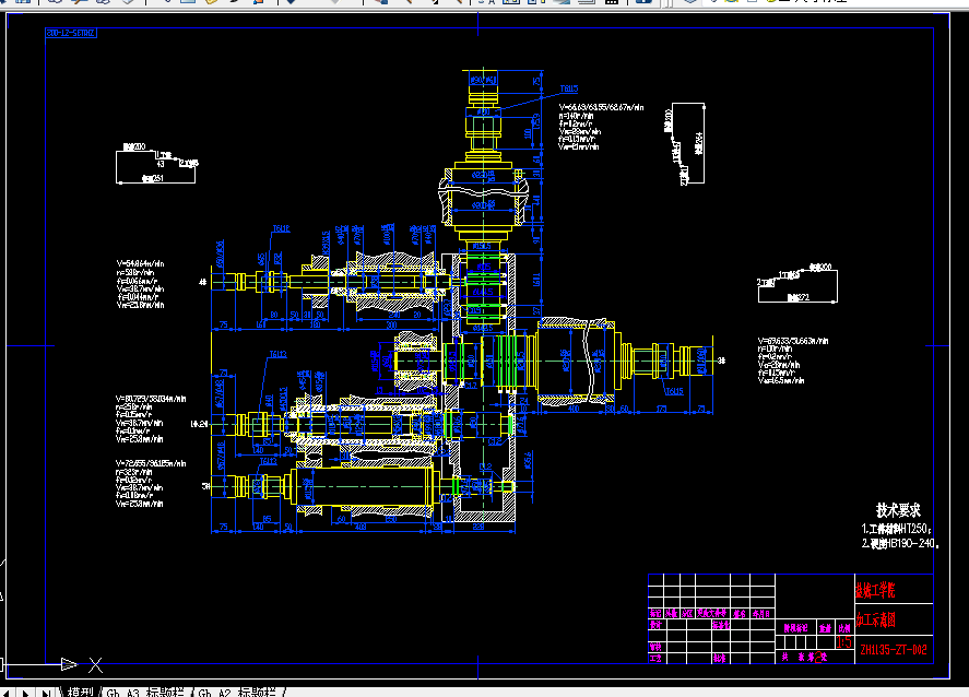 摘 要:柴油机机体为大批量生产的零件,为了提高其生产效率,满足被加工零件的精度要求,保证加工性能稳定,本课题设计了一台用于ZH1135柴油机机体三面半精镗的组合机床。设计内容主要分为总体设计和左主轴箱设计两部分。总体设计包括机床配置型式的确定、结构方案的选择以及“三图一卡”的绘制。左主轴箱设计包括绘制多轴箱设计原始依据图、确定主轴和齿轮;完成动力计算、设计传动系统;绘制多轴箱装配图和零件补充加工图。机床采用卧式三面加工的方案,加工和装配的工艺性好,零件装夹方便。主轴箱选用的是通用主轴箱。设计过程中尽量采用了标准零部件,设计出的组合机床结构简单,操作方便,加工精度高,减轻了劳动强度,提高了加工效率,具有较好的经济性和适用性。