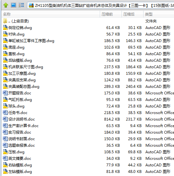 摘要:ZH1105型柴油机机体为大批量生产的零件,为了提高生产效率,满足被加工零件的精度要求且保持加工精度稳定,本课题设计了一台用于ZH1105型柴油机机体三面钻孔的组合机床。第一部分是总体设计,首先,进行了总体方案论证,采用单工位三面钻削组合机床,刀具选用高速钢麻花钻,并根据切削用量的选择,计算切削力、切削扭矩及切削功率,确定主轴直径、外伸尺寸、接杆型号,选择滑台、动力箱等通用部件,再确定动力部件的工作循环及工作行程,完成机床联系尺寸的制定。最后绘制了三图一卡。第二部分是夹具设计,经过对被加工零件的全面分析,导向采用固定钻模板可换钻套导向,夹紧装置采用机械夹紧机构,直接夹压于工件上,反应快捷,夹压平稳可靠,夹具体有良好的刚性,使夹具能长期保持可靠的精度和稳定性。该组合机床不仅能保证钻孔精度,还能提高加工效率,降低工人的劳动强度。设计的夹具定位可靠、夹压稳定、操作方便,达到了设计要求。