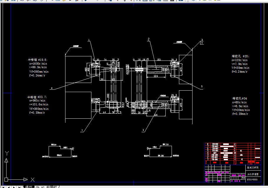摘要:随着生产的发展和专业化程度的提高,很多企业的产品产量越来越大,精度也越来越高。首先,加工时,同时参加工作的刀具少,限制了机床生产率的提高;其次,在加工多孔的工件时,需要对工件进行多次的定位和夹紧,使零件的加工精度和生产率降低;第三,因为在一台机床上总是加工一种工件,使通用机床的部件和机构造成冗余。因此,为了提高生产效率,满足加工要求,本课题设计了用于加工双筋蹄零件的镗铰组合机床之镗削主轴箱。根据被加工零件确定加工孔的数量、位置、切削用量及主轴类型,拟订了主轴箱的传动方式,应用最优化方法传递功率,削减振动,确定传动参数,设计轴的结构,进行如轴、轴承等相关零件的强度校核计算。通过以上设计,实现了两个双筋蹄零件一次加工完成,较好地达到了设计要求。