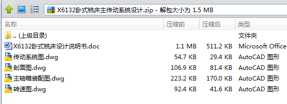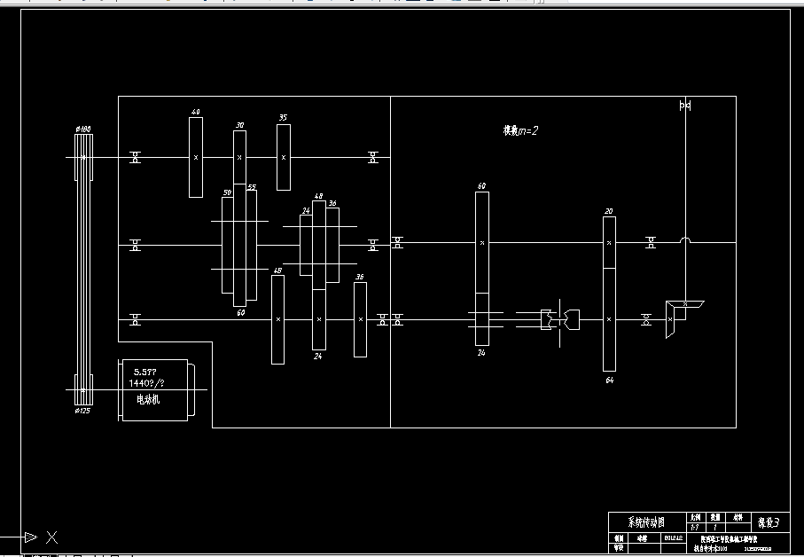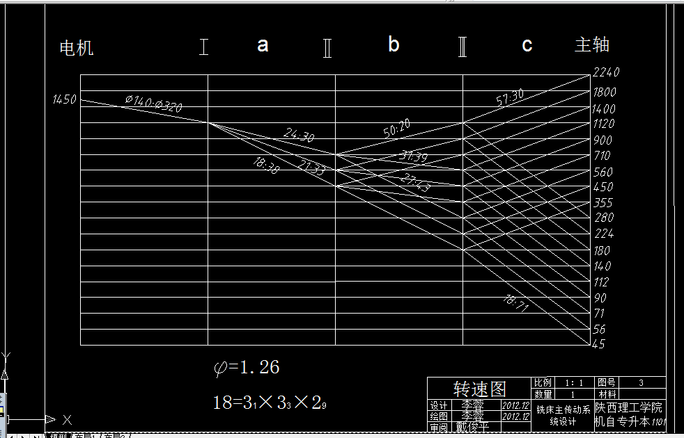 本设计从下达任务起,经过现场调查和查阅文献资料入手,历经三周的时间完成。在设计中,首先根据课程设计所要求的技术参数确定机床设计中所需要的参数,即原动机的功率、机床主轴箱的转速数列公比;然后确定机床主轴箱的主传动系统结构,拟订机床的结构网和转速图;查资料,根据转速图确定机床内的各个主要零件的计算转速,根据计算转速确定各级传动的传动比,根据传动比来确定各级传动的齿轮配合的齿轮齿数。根据机床主轴箱的传动链来计算各级转速的实际值与理论值之间的误差。在设计中主要是要计算主轴箱里各个零件的选用是否满足要求以及原动机与主轴箱间的动力传递装置的计算。主轴箱的计算包括摩擦离合器的校核、齿轮的校核、轴的校核、轴承的校核、键的校核、主轴的校核计算等。原动机与主轴箱的动力传递采用的是带传动装置。最后根据资料和参考同类机床来设计该铣床的主传动系统,并绘制其装配图。