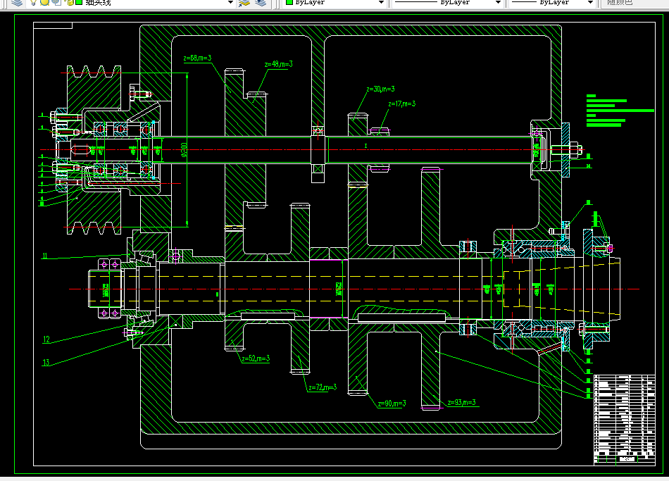 根据已确定的运动参数以变速箱展开图的总中心距最小为目标,拟定变速系统的变速方案,以获得最优方案以及较高的设计效率。在机床主传动系统中,为减少齿轮数目,简化结构,缩短轴向尺寸,用齿轮齿数的设计方法是试算,凑算法,计算麻烦且不易找出合理的设计方案。本文通过对主传动系统中三联滑移齿轮传动特点的分析与研究,绘制零件工作图与主轴箱展开图及剖视图。