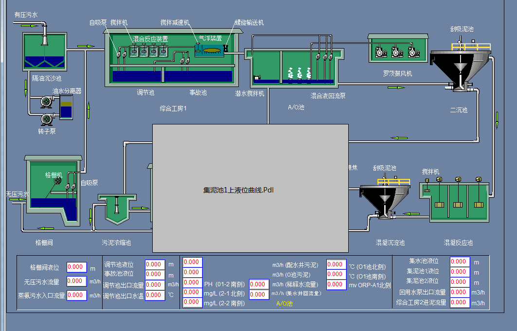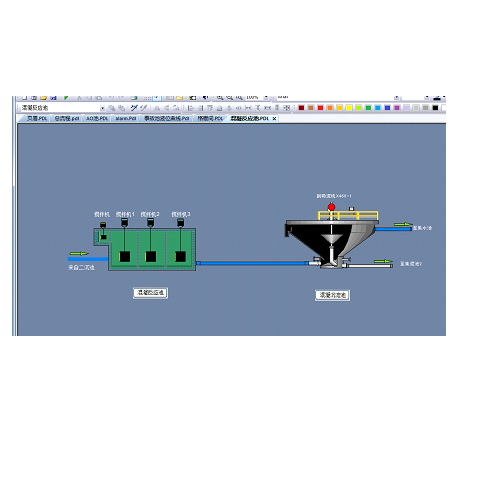 采用西门子S7-300 PLC为下位机,采用Wincc为上位机进行监控,通过各种传感器例如流量,液位,温度,PH,溶解氧,COD等进行检测污水各变量,通过控制格栅机,格栅间泵,调节池泵,回水泵,曝气机等进行污水处理,达到污水处理的目的