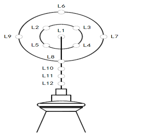 模式2控制如下:点亮L12,点亮L11,点亮L10,点亮L8,点亮L1,点亮L1,L2,L9;点亮L1,L5,L8;点亮L1,L4,L7;点亮L1,L3,L6;点亮L1;点亮L2,L3,L4,L5;点亮L6,L7,L8,L9;点亮L1,L3,L7;点亮L1,L4,L8;点亮L1,L5,L9;点亮L1,L2,L3,L4,L5;点亮L6,L7,L8,L9,然后L8开始循环。