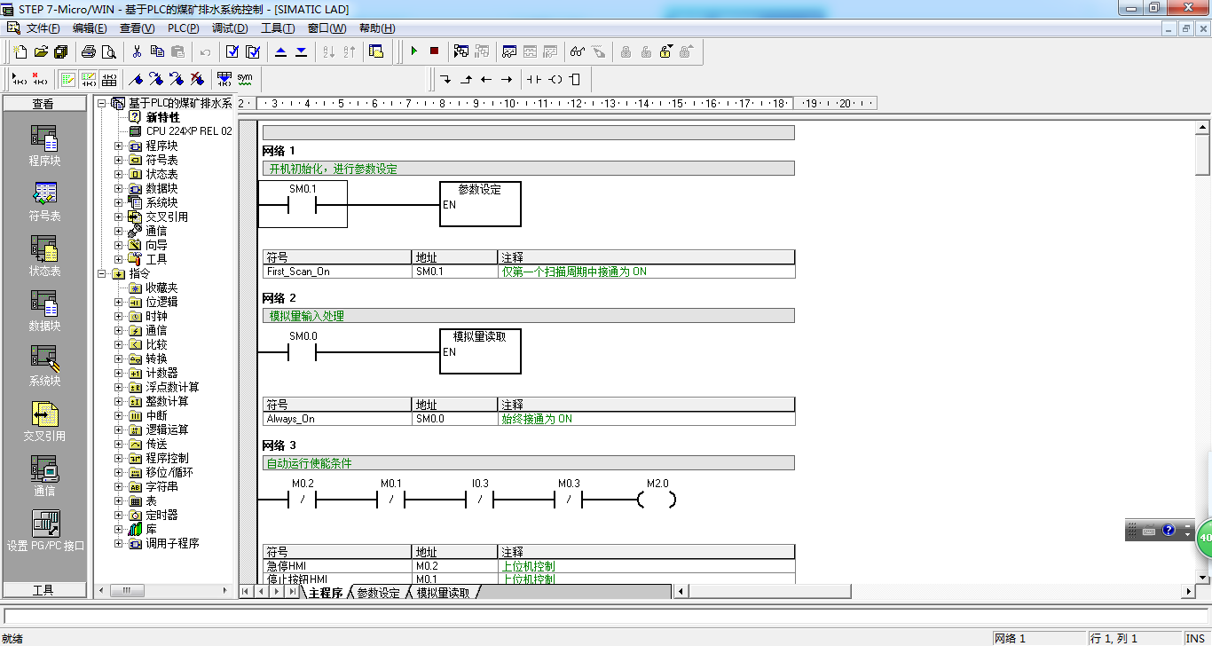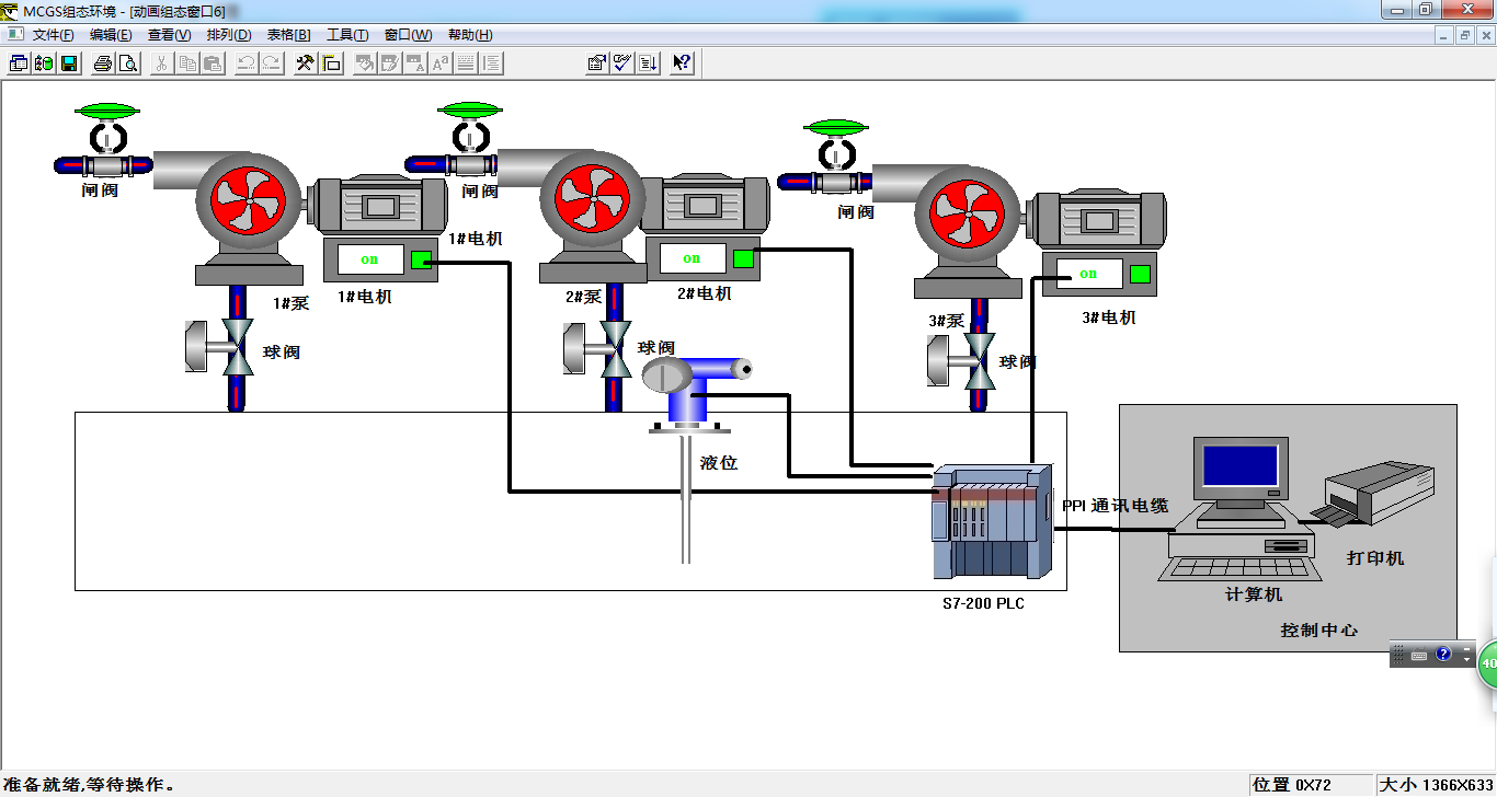 通过超声波液位传感器检测水位,根据水位情况控制1号水泵,2号水泵运行。水位低时,不启动水泵运行。水位低于高水位,高于中水位,启动1号水泵运行。水位高于设定高水位,启动1号水泵和2号水泵。水泵3是备用水泵,当1号或者2号水泵故障时,当需要启动1号或者2号水泵时,自动启动3号水泵。