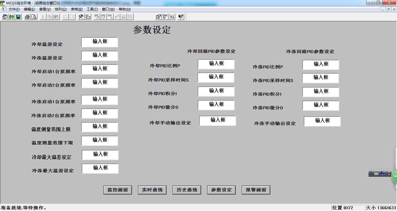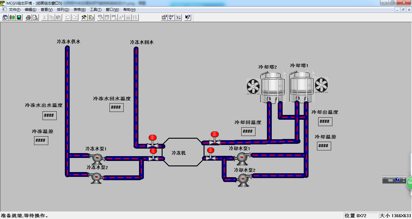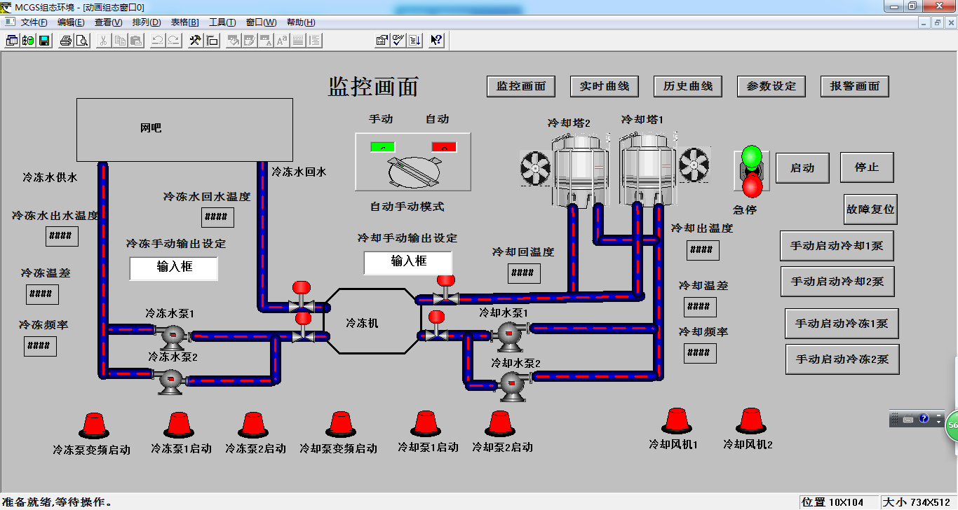 网吧中央空调变频节能控制系统示意图如图2-1所示,采用一台变频器驱动2台冷冻泵变频运行将冷冻水供网吧,然后变热的水返回冷冻机组,进行冷却。采用一台变频器驱动2台冷却水泵,供热水入冷却塔,经2台冷却塔冷却后返回,将冷冻水进行降温。采用传感器分别检测冷冻水出水和回水温度,检测冷却水出水和回水温度。计算冷冻水回水和出水温差,计算冷却水出水和回水温差。根据设定的冷冻水温差,比较计算温差,并且根据变频器输出,比较启动启动1台冷冻频率,启动2台冷冻频率,控制冷冻泵运行和运行台数。同样的,根据设定的冷却水温差,比较计算的冷却温差,并且根据冷却变频器输出,比较启动启动1台冷却频率,启动2台冷却频率,控制冷却泵运行、冷却风机运行和冷却泵运行、冷却风机运行台数。