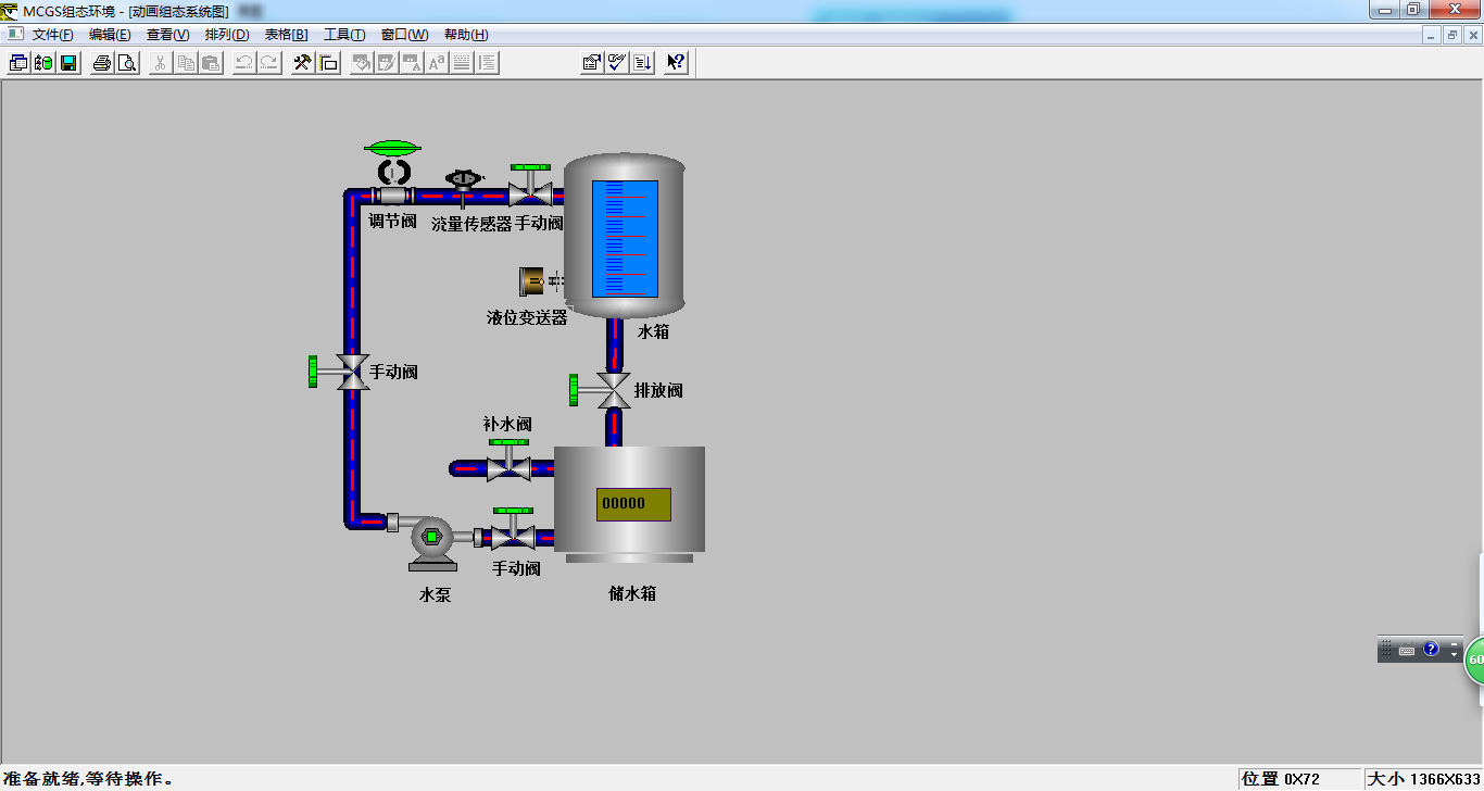 蓄水池中的水通过水泵、手动阀和调节阀泵入水箱。该控制系统的控制目标是使水箱的液位稳定在设定的液位。水箱底部安装有液位传感器,用于检测水箱液位。在管路中安装涡轮流量计以检测液体流量。首先,系统需要通过供水阀为储罐提供足够的储水。打开供水回路中的手动阀。启动水泵,通过水箱水位PID、涡轮流量PID串级控制,自动控制阀门开启,控制水箱水位