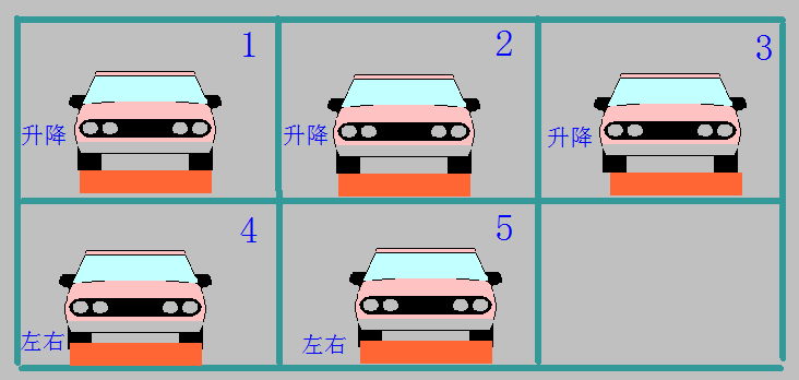 例如呼叫1车,则先需要4,5车位车架右移动到位,然后1车位车架下降到底,进行存取,存取完成,1车位车架上升到位,然后4,5车位车架左移返回原位,完成1车呼叫。