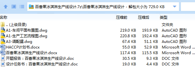 本设计所生产的百香果冰淇淋,是将取出的果汁经过打浆、过滤、澄清、脱气、灭菌、冷却、均质等操作得到的原汁成品,作为配料,加入到冰淇淋的生产中,经过灭菌、均质、冷却、老化、凝冻、速冻等操作,得到的一种特色冷饮。