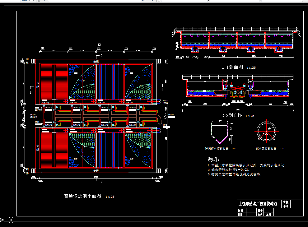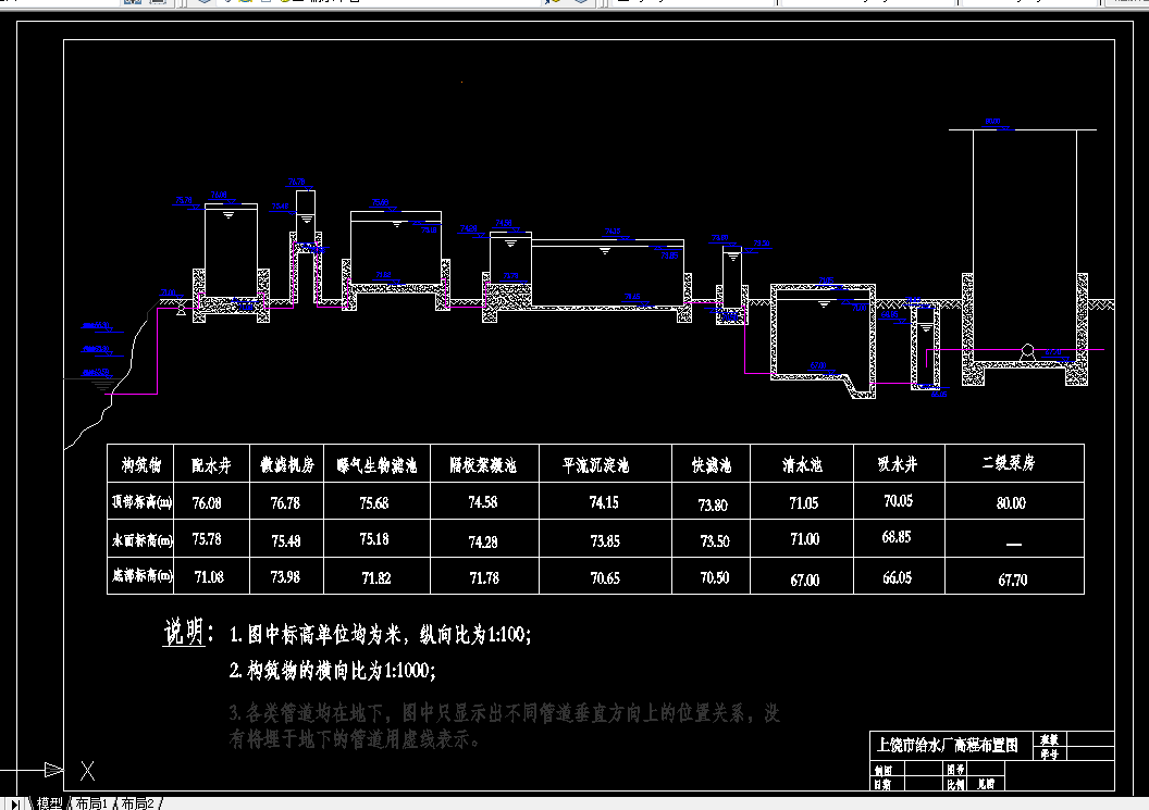 ④ 三张2号图纸(一张为平面图,第二张为高程图,第三张为某一构筑物图)。设计图纸所采用的比例、标高、管径、编号和图例等应符合《给水排水制图标准》的有关规定。