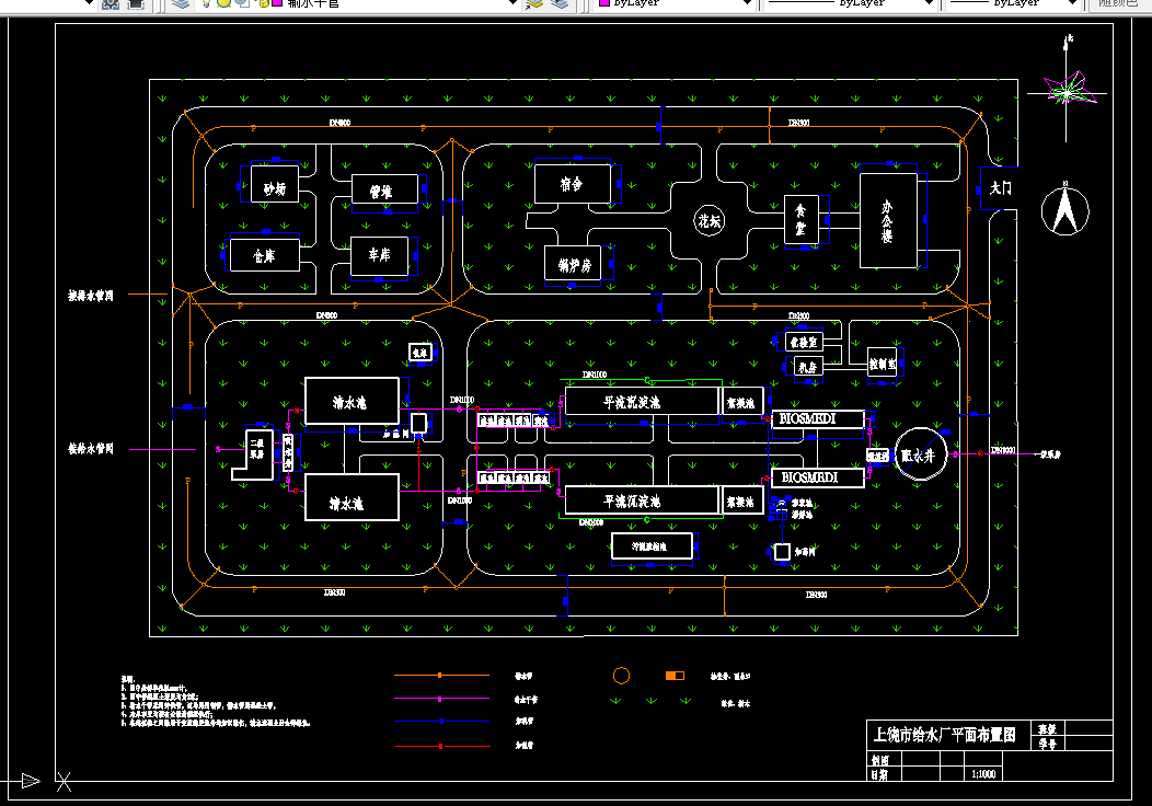 安排辅助生产及附属生活建筑物。对除了工艺流程之外的附属设施进行简单筛选与设计,达到整个工艺流程能够健康的运行,辅助生产设施主要包括:取水泵站、一级泵站、清水池、药剂房、管道等;附属生活构筑物包括办公用房、化验室、车库、仓库、值班室、配电室、检修室等。对整个厂区进行规划设计,以达到各个建筑与构筑物之间布置科学、合理,面积节省、费用最低的效果。